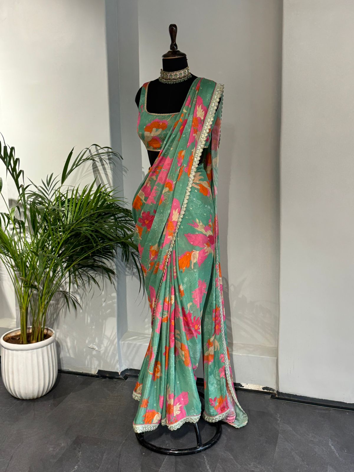 Where soft pastels meet blooming florals — this saree is a love letter to springtime elegance. The sea-green drape kissed with coral and fuchsia hues is perfect for brunches, mehendis, or just days that deserve a little extra charm