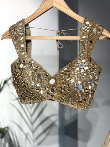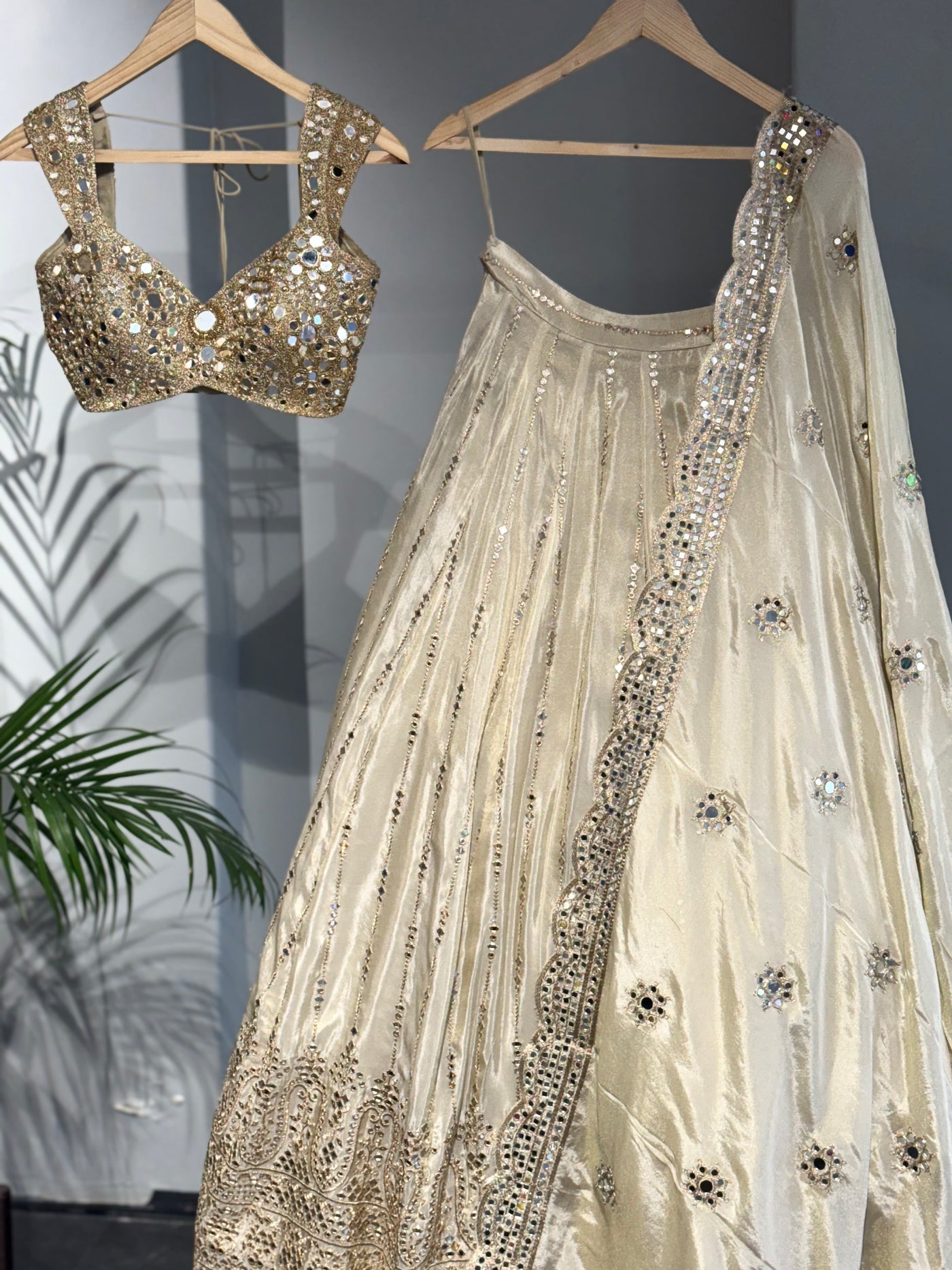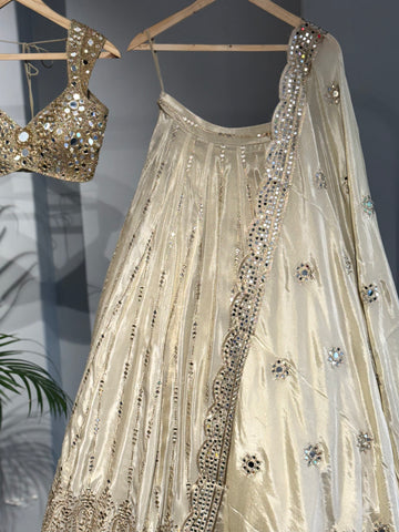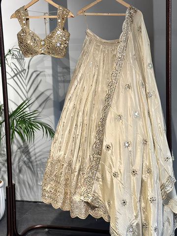 A timeless symphony of gold and shimmer — Golden Aura brings regal elegance to life. Adorned with intricate mirror work and delicate embroidery, this lehenga is made to make every moment shine a little brighter.