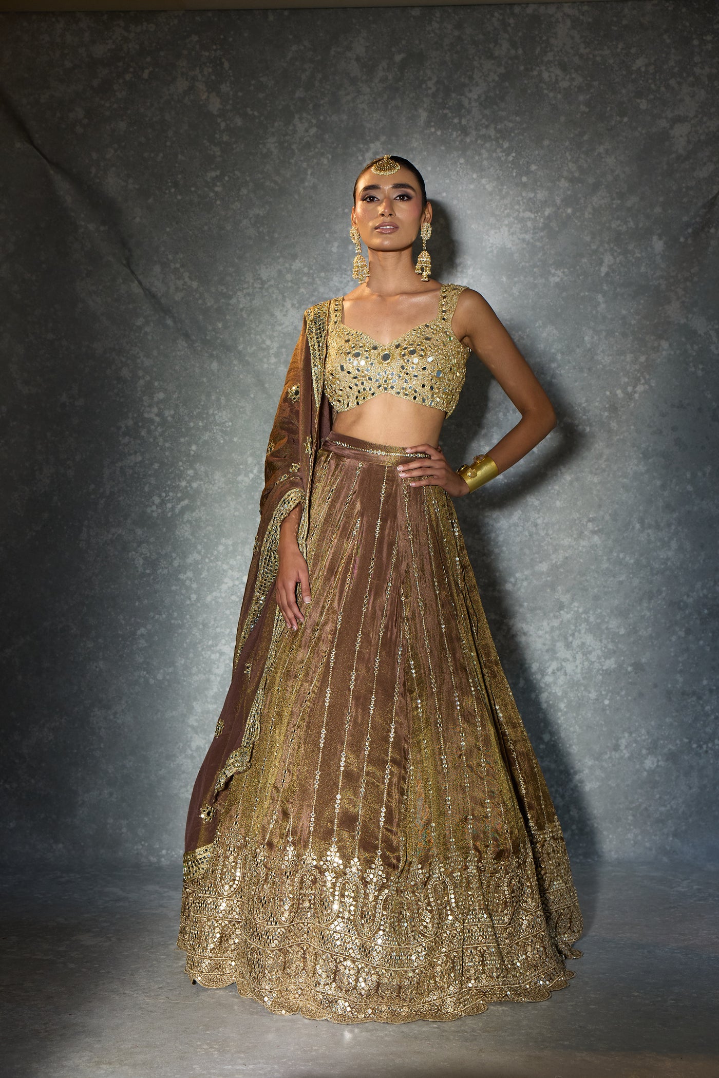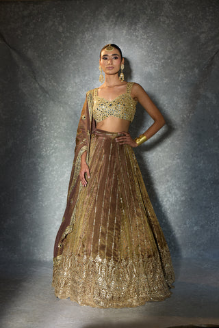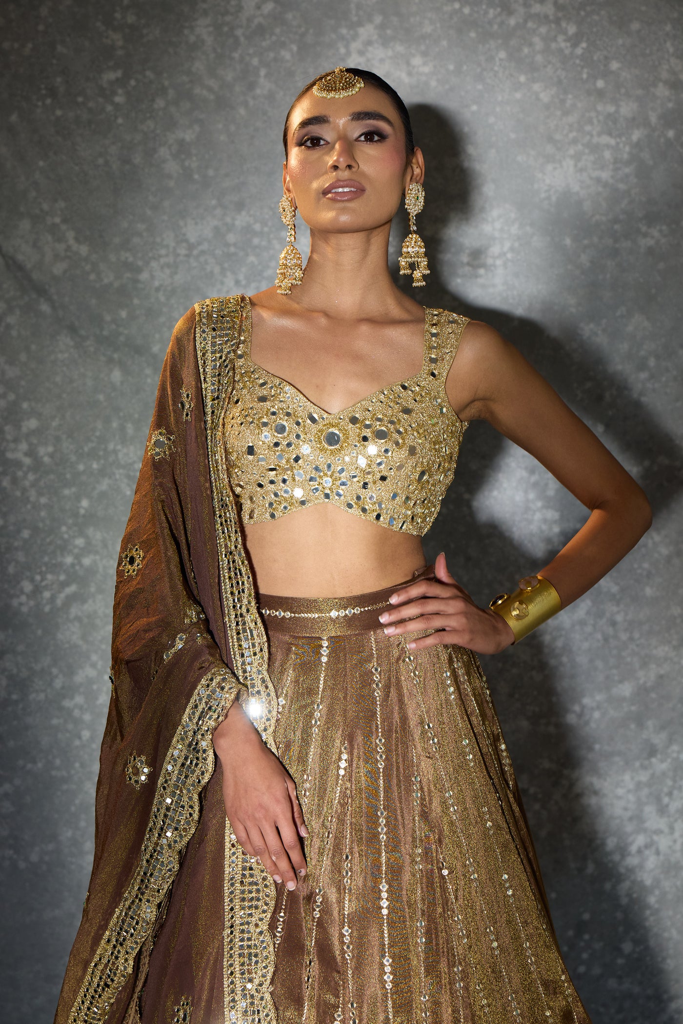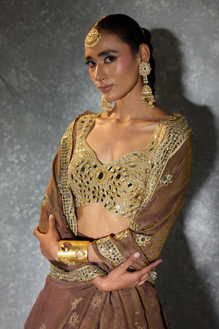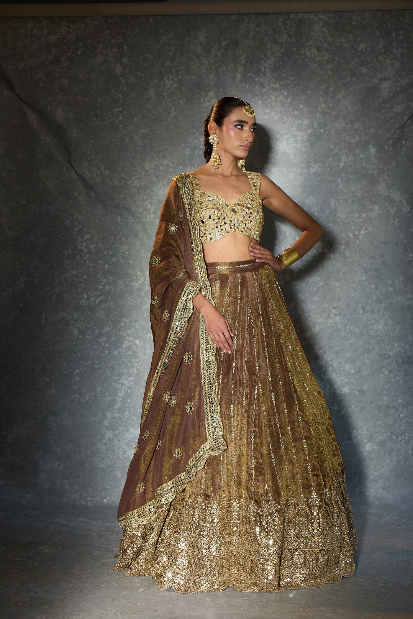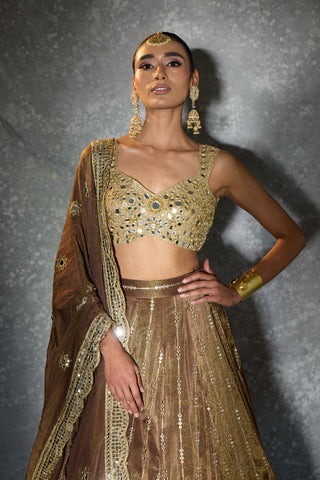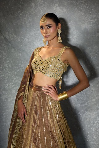 Dipped in molten gold and wrapped in mirror-kissed elegance — “Light of Gold” is where old-world charm meets modern glamour. From the heavily embellished blouse to the intricately detailed flare and the delicately embroidered dupatta, every panel glows with craftsmanship. A statement piece for the woman who loves her shine bold, timeless, and beautifully regal