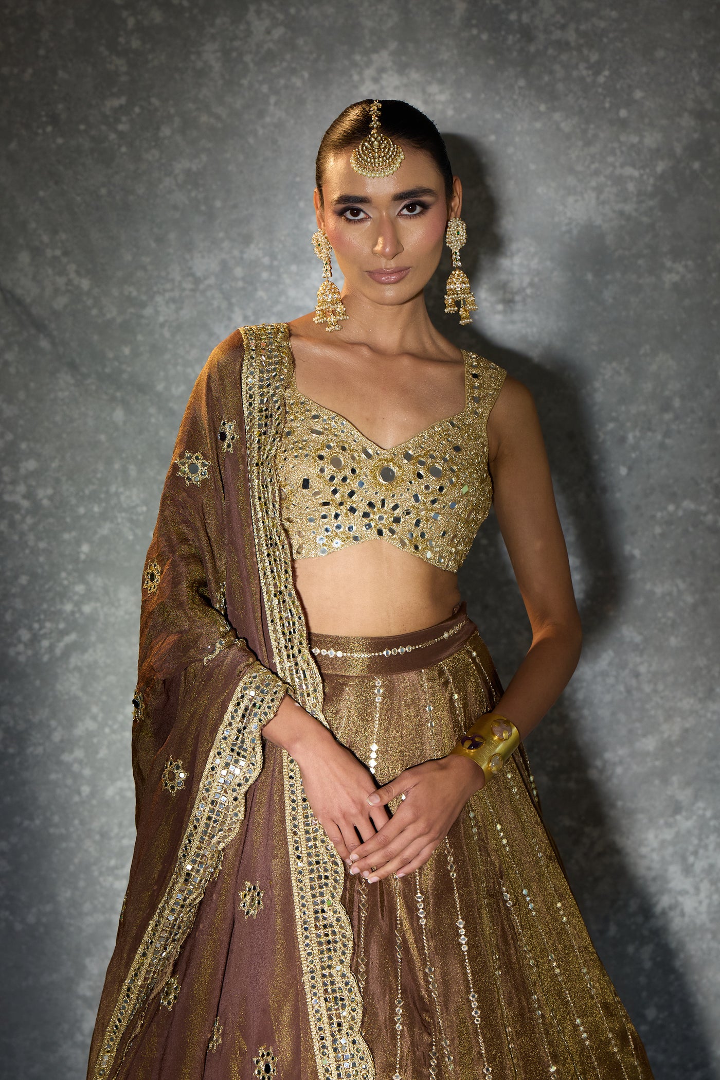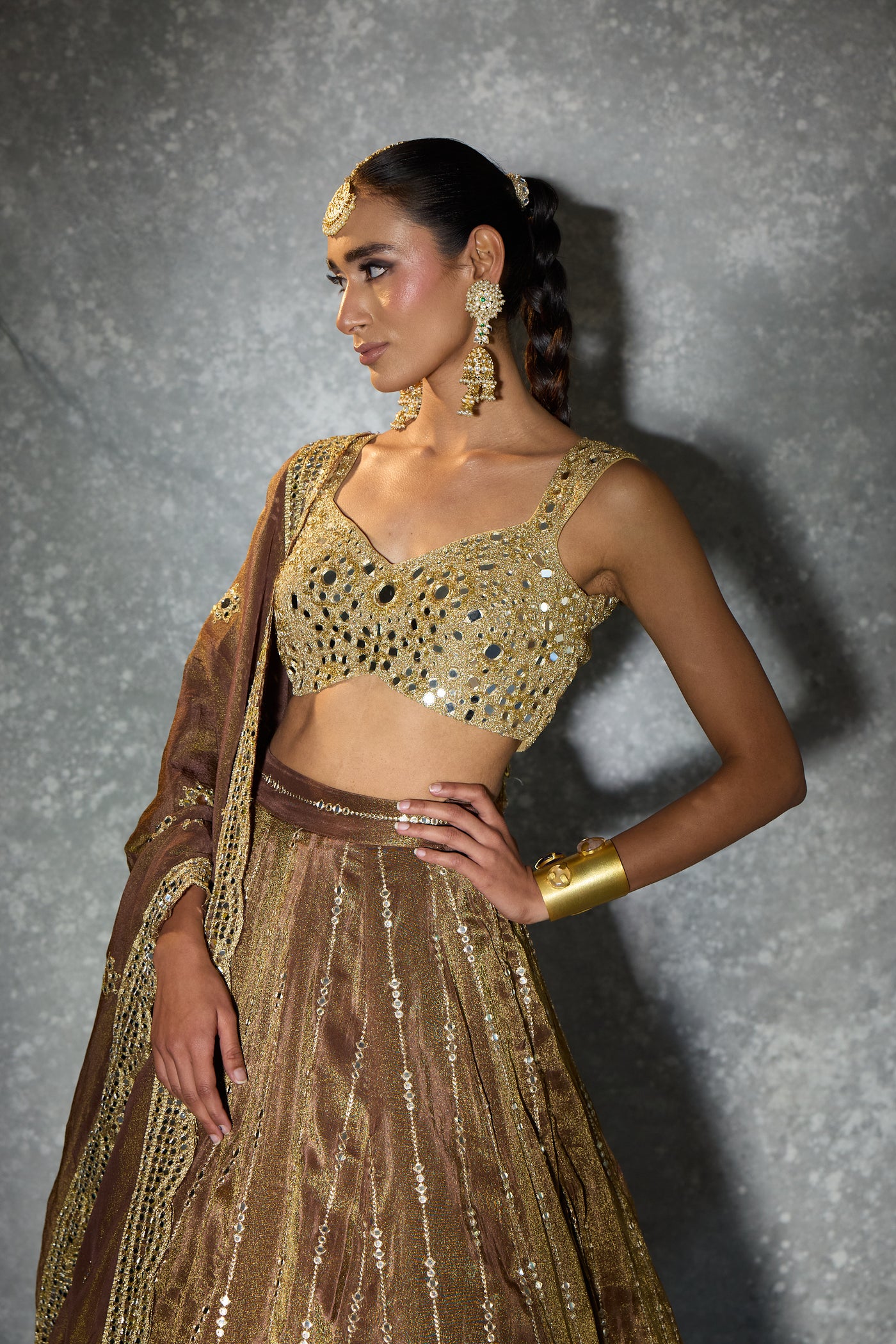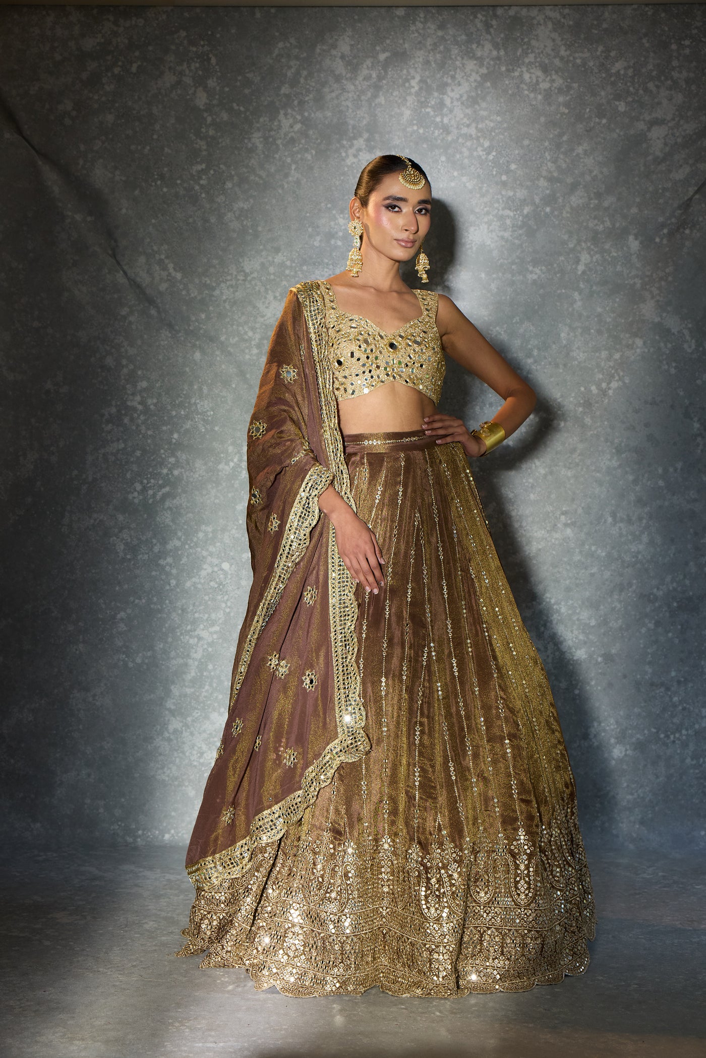 Dipped in molten gold and wrapped in mirror-kissed elegance — “Light of Gold” is where old-world charm meets modern glamour. From the heavily embellished blouse to the intricately detailed flare and the delicately embroidered dupatta, every panel glows with craftsmanship. A statement piece for the woman who loves her shine bold, timeless, and beautifully regal