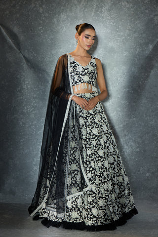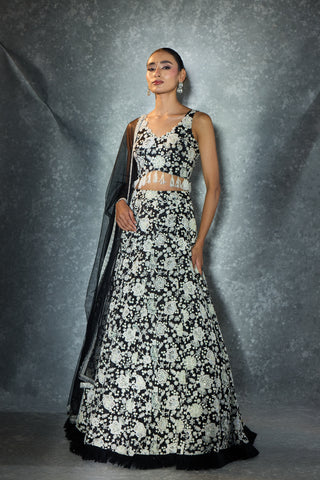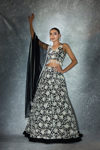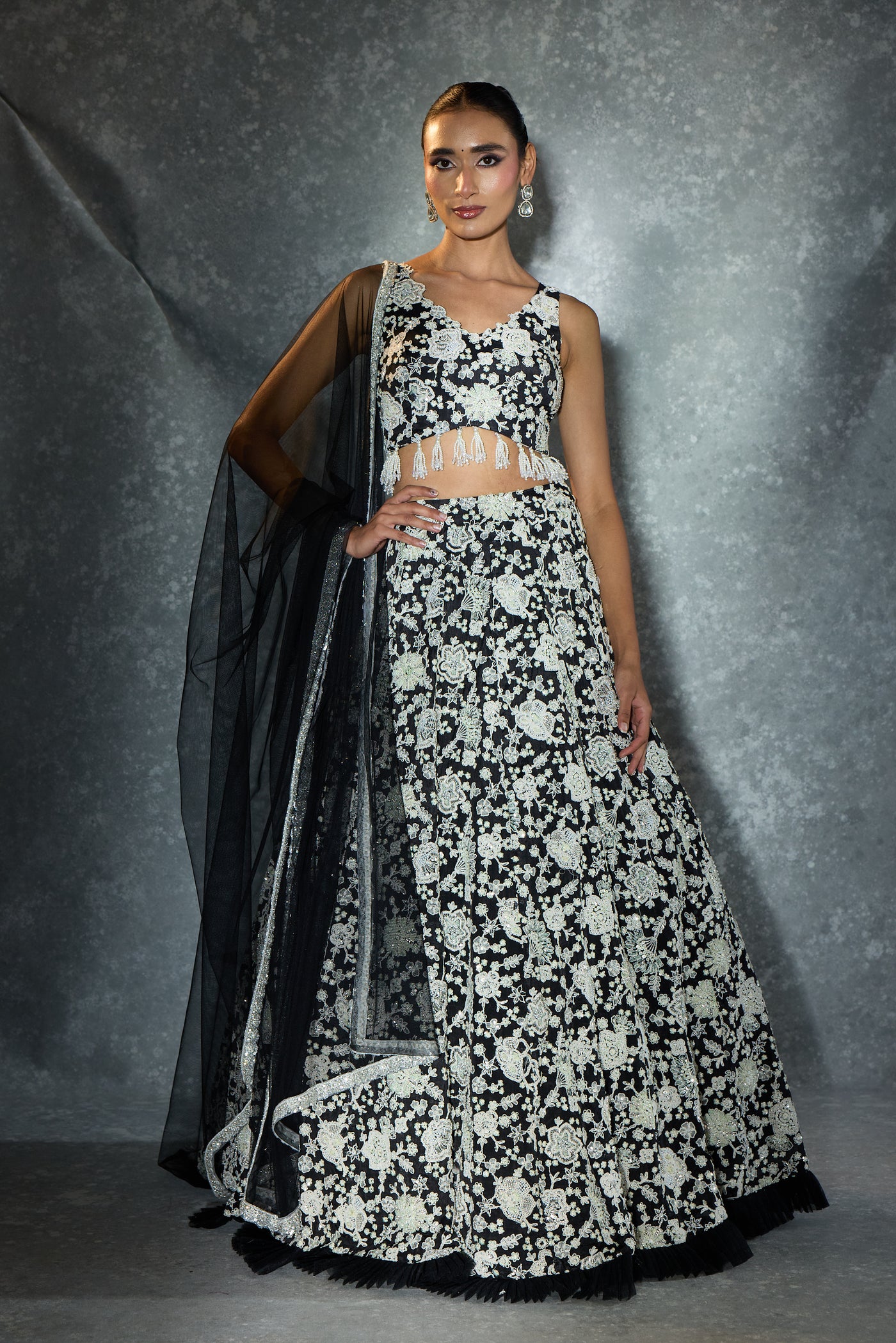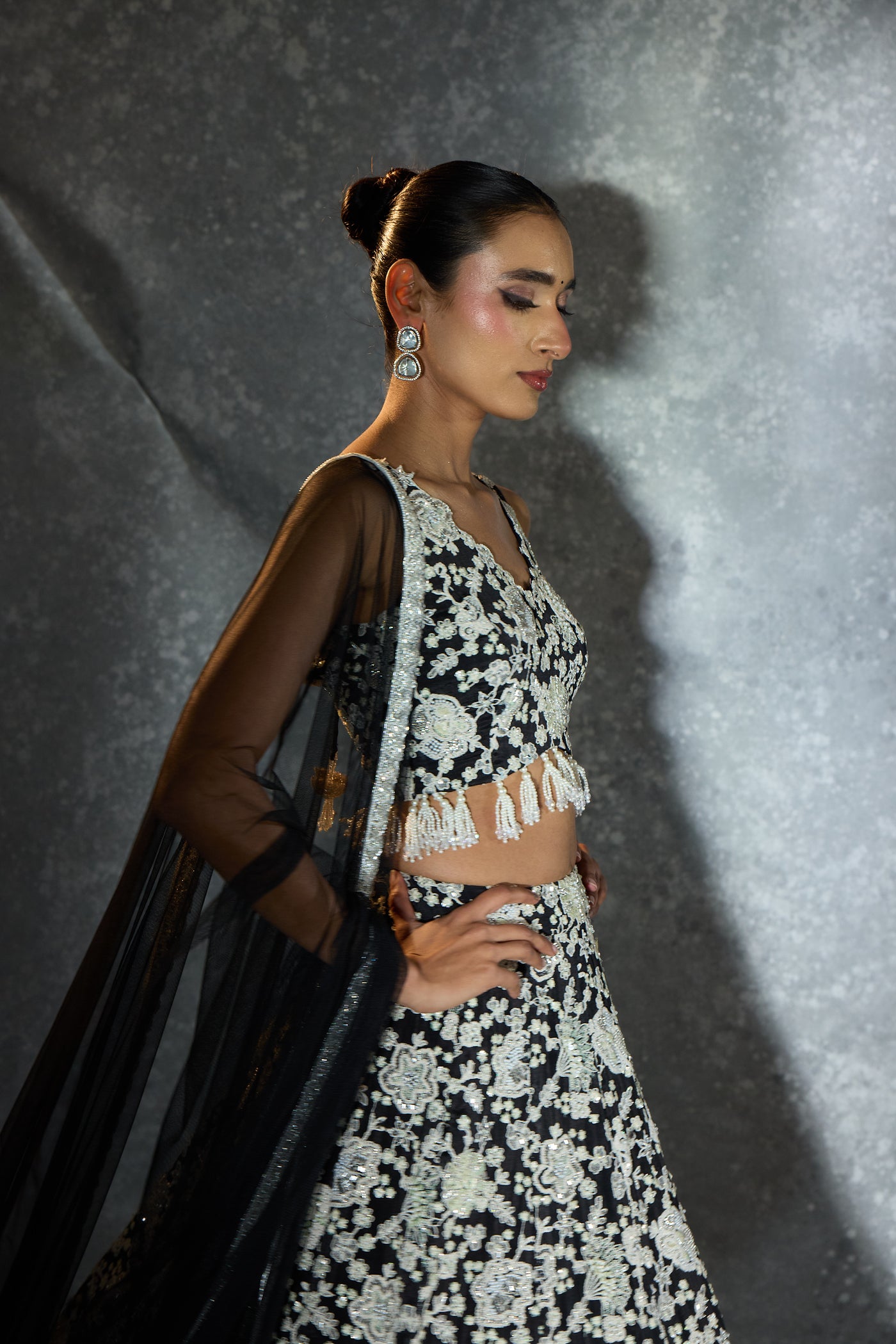 Timeless elegance in black and silver ✨🖤 This exquisite lehenga features delicate floral embroidery throughout, paired with a cropped blouse with statement tassel detailing and a flowing sheer dupatta. Minimalist styling with drop earrings completes this sophisticated look