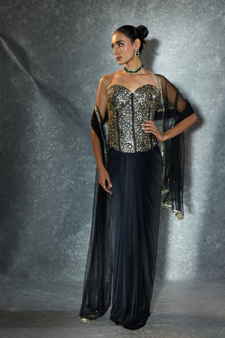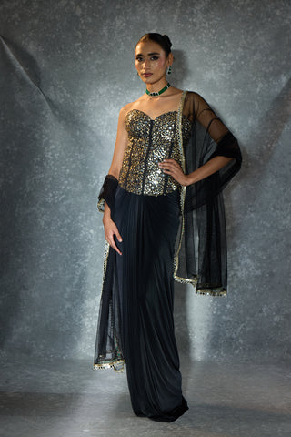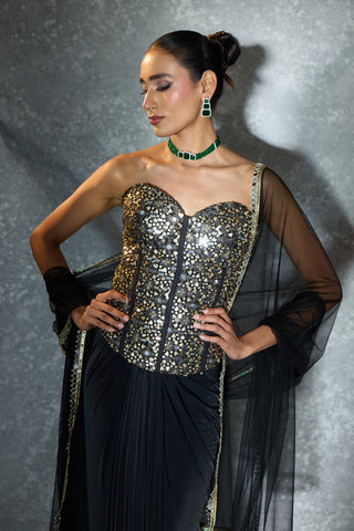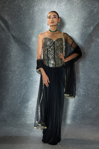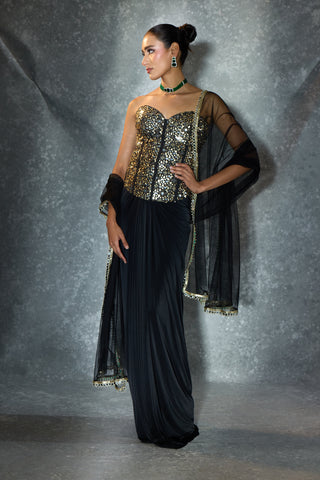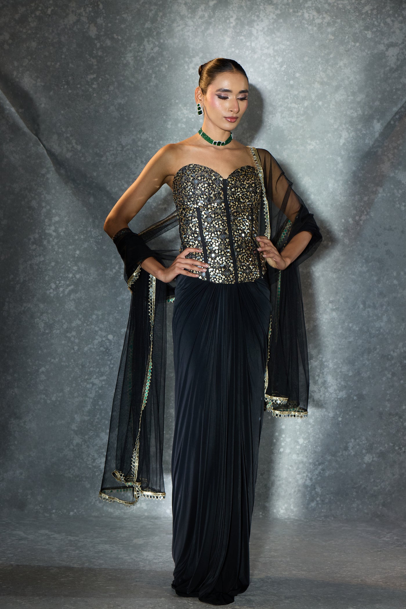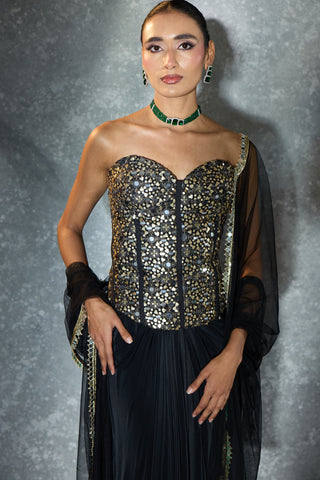 Elegance meets edge in black ✨ This show-stopping ensemble features a gold sequined corset top paired with a draped skirt and sheer black dupatta with embellished borders. Finished with an emerald choker for that touch of royalty