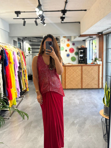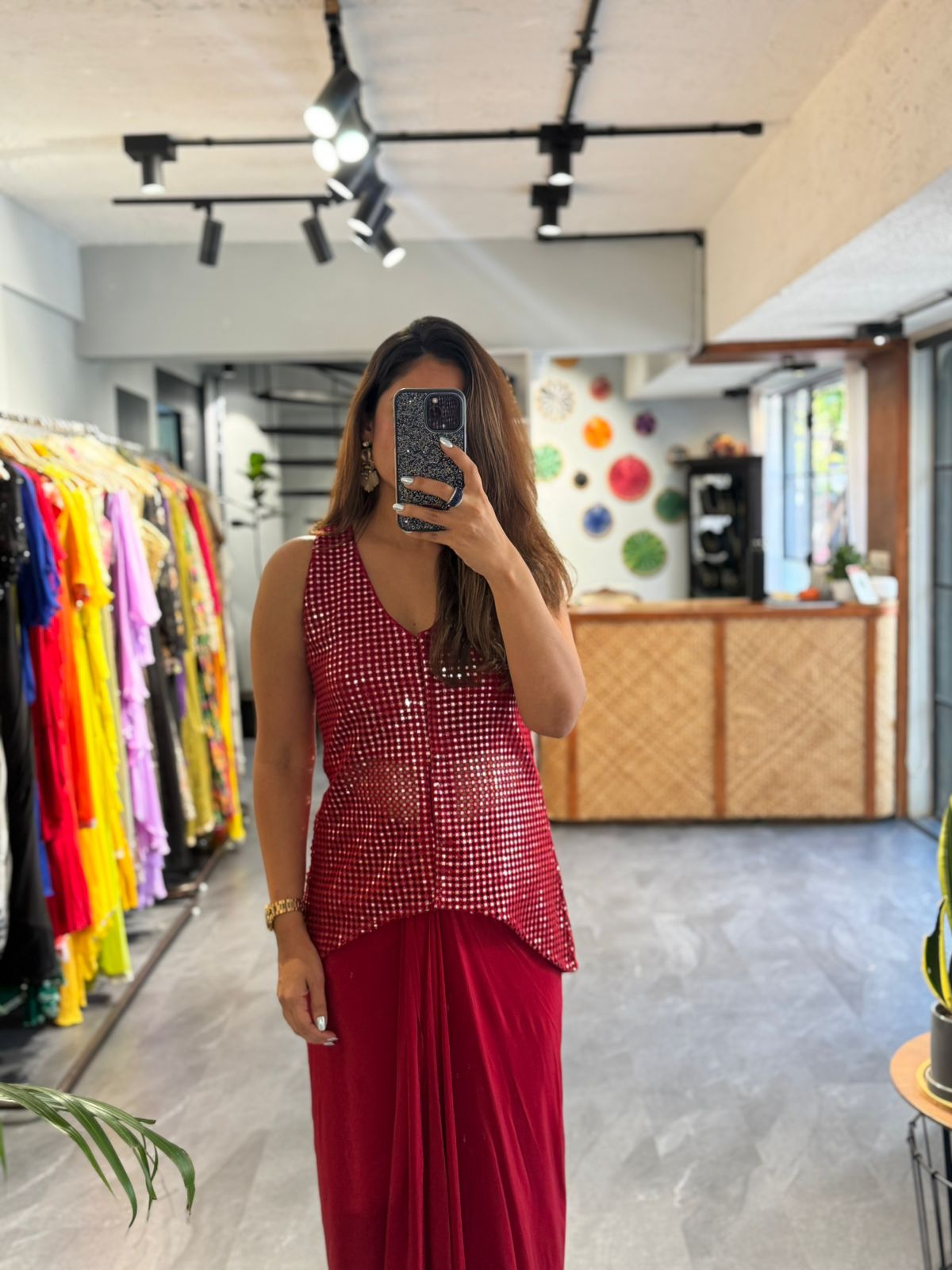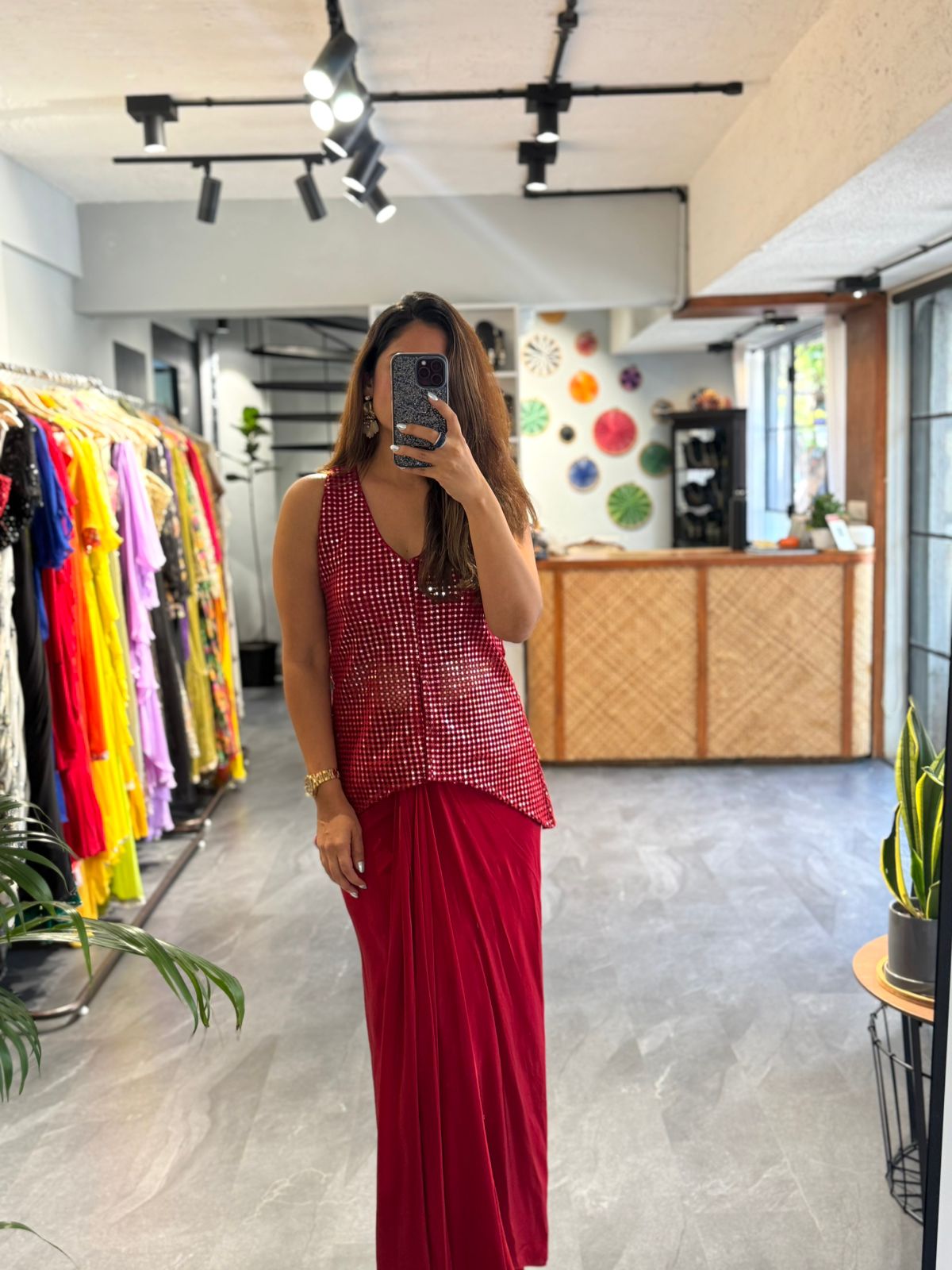 This red drape skirt paired with a mirror detailed blouse is the statement you didnt know you needed. Perfect for cocktail nights, sangeet soirees or when you just want to shine.